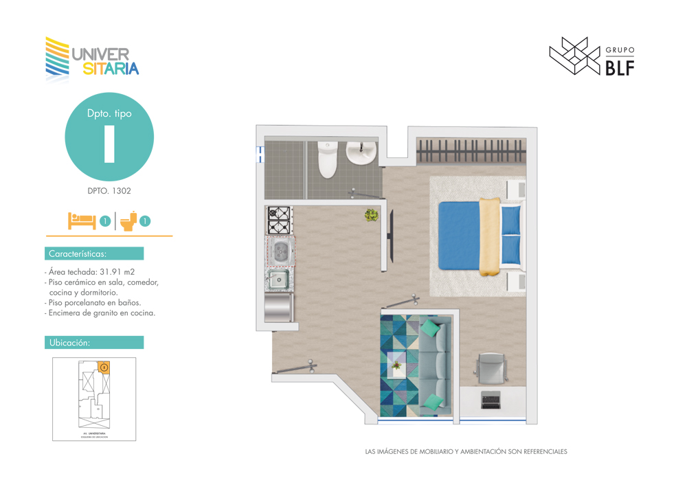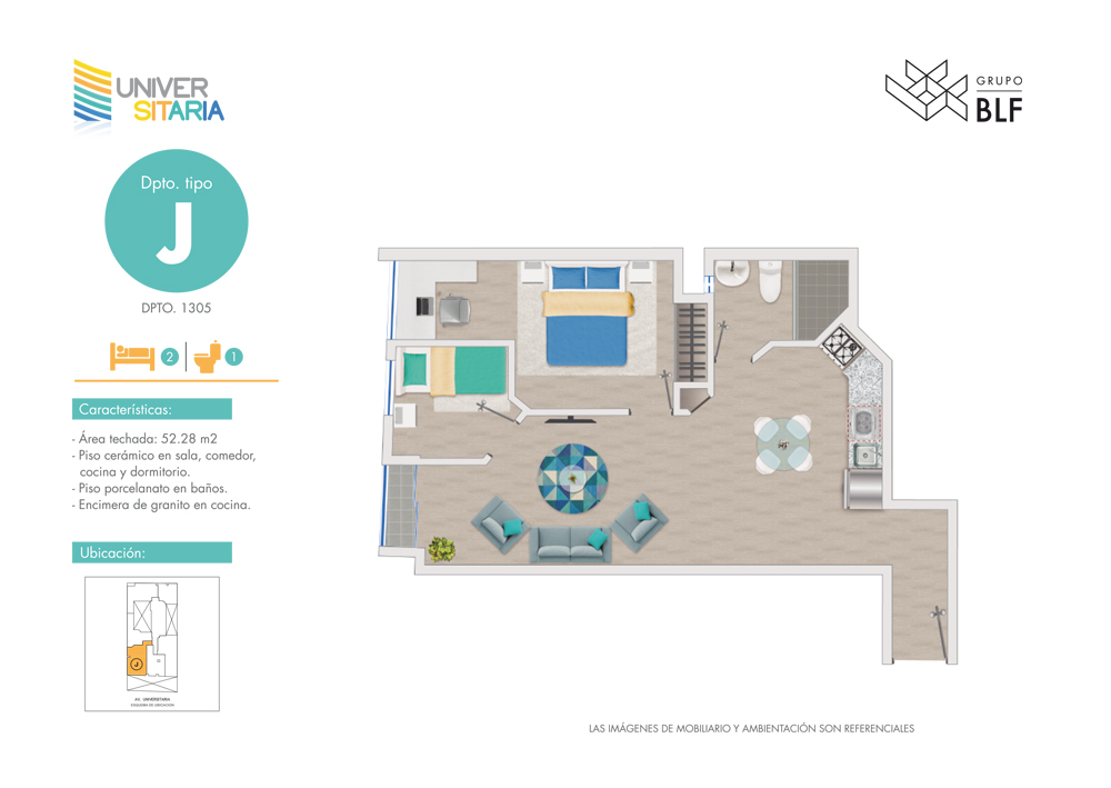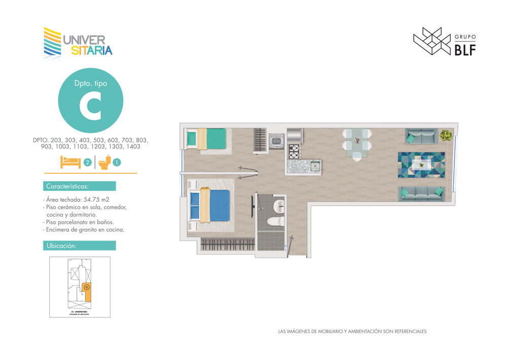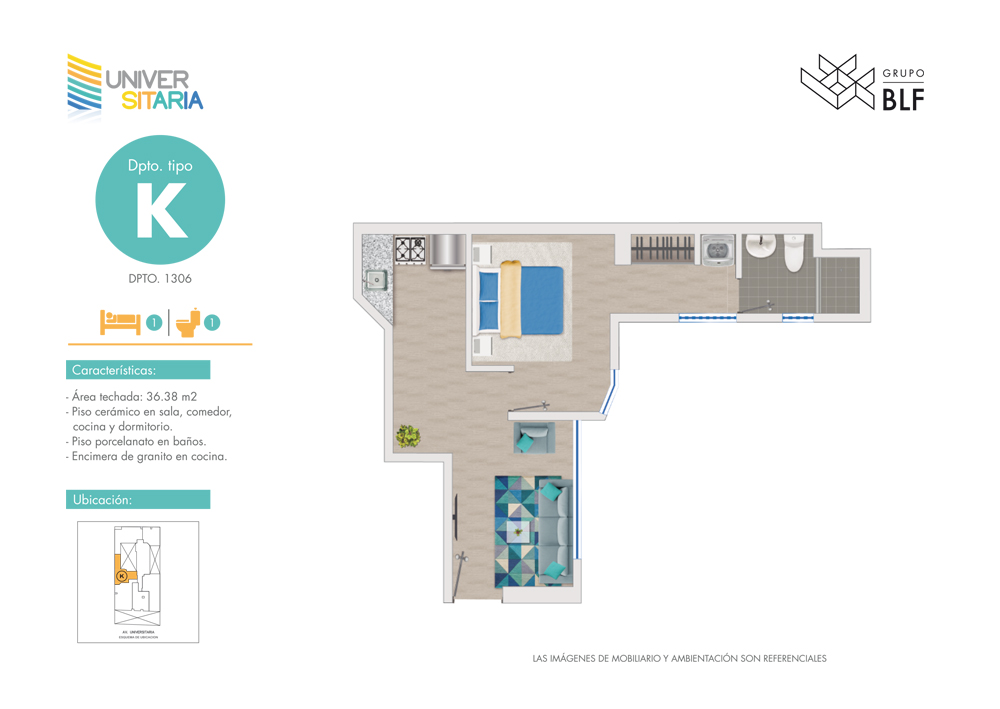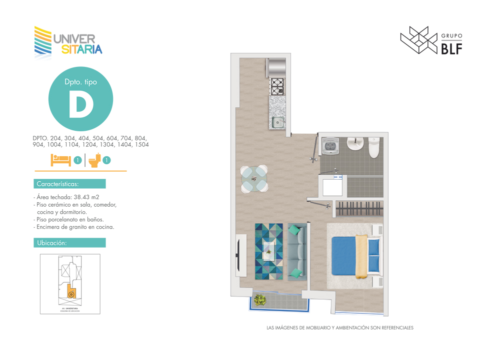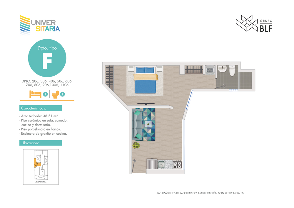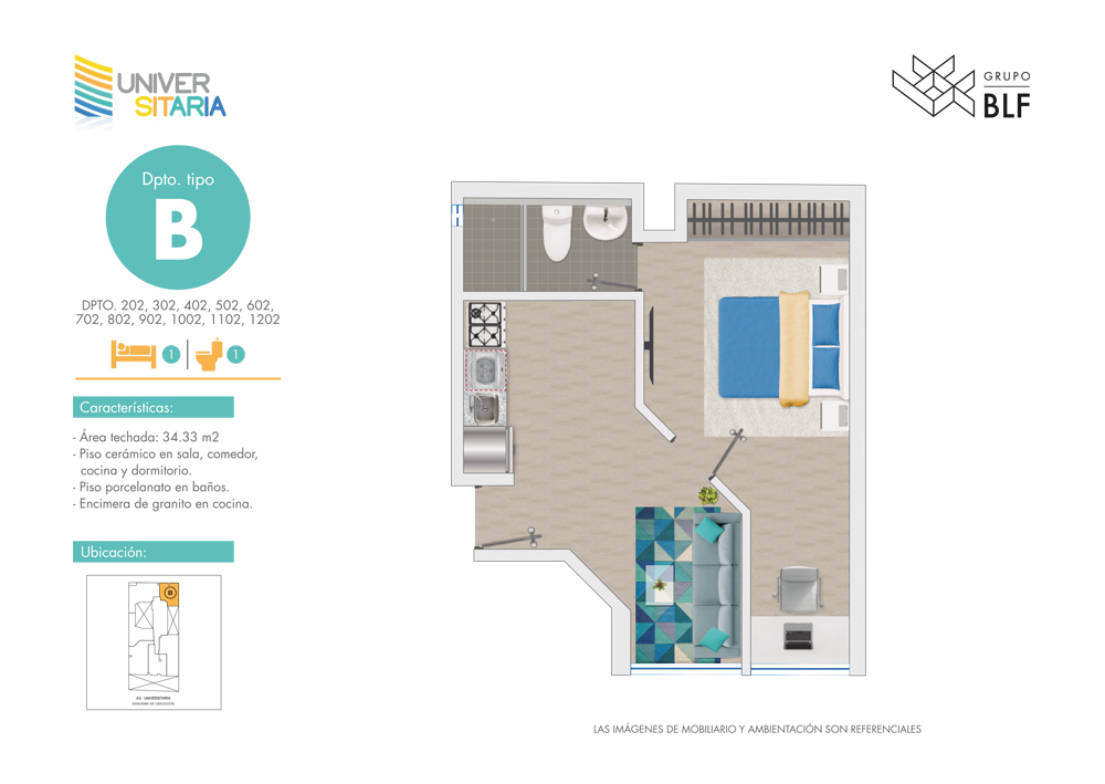 Una propuesta inmobiliaria enfocada en cubrir las necesidades de vivienda y seguridad de los estudiantes. Una gran propuesta inmobiliaria con una oferta de 104 departamentos tipo flat de 1,2 y 3 dormitorios que van desde 28 m2 hasta los 79 m2 para cubrir en gran parte la demanda existente.